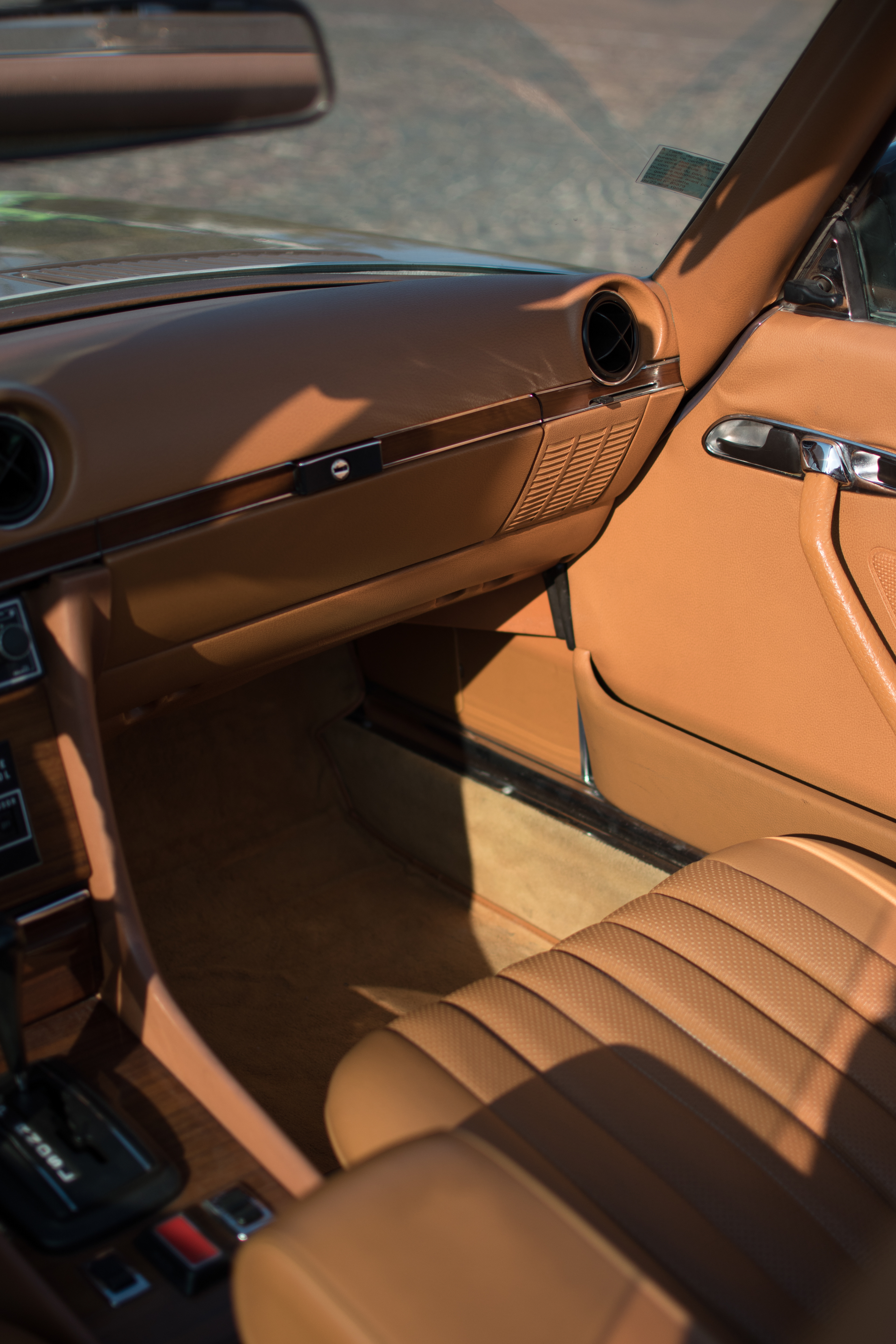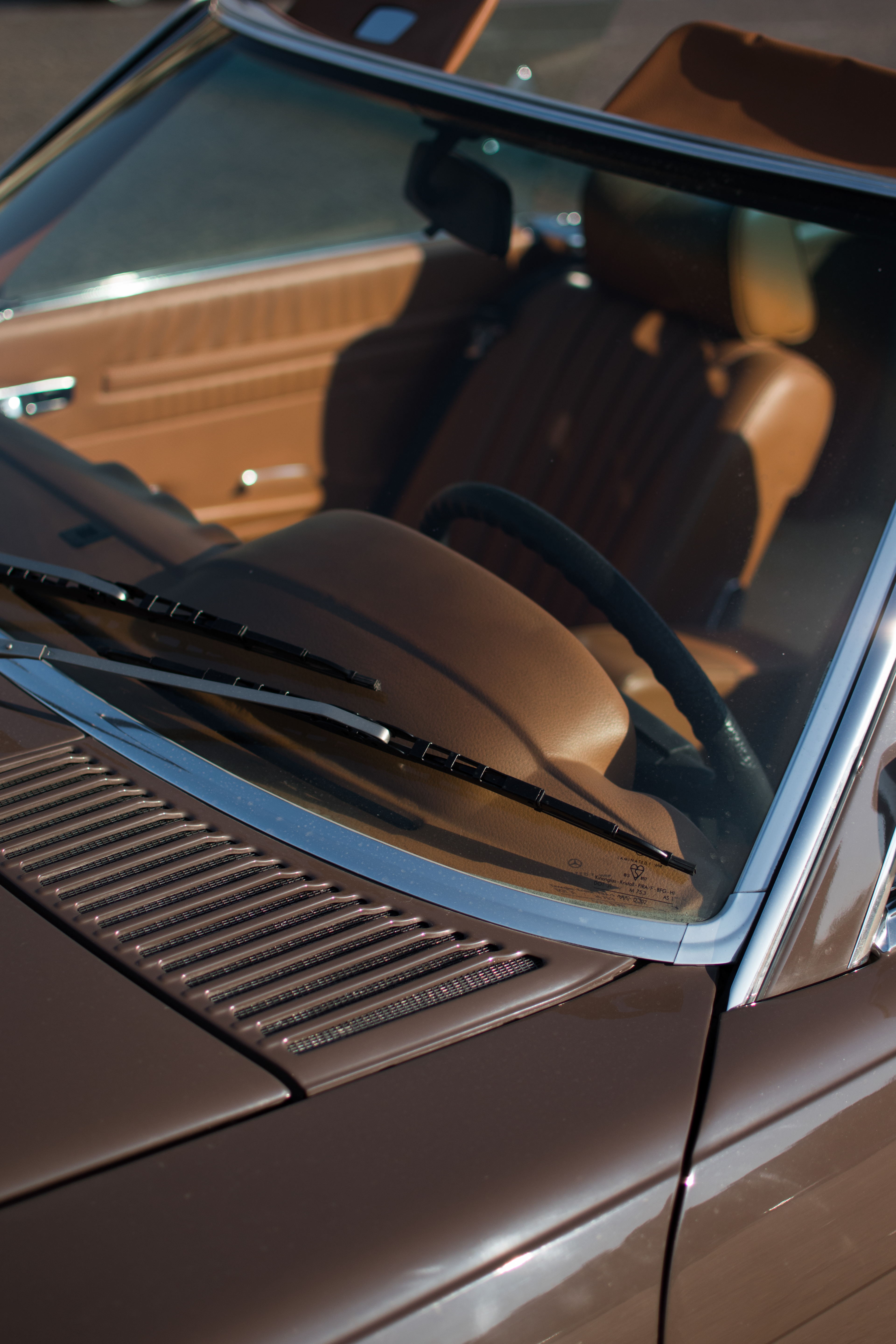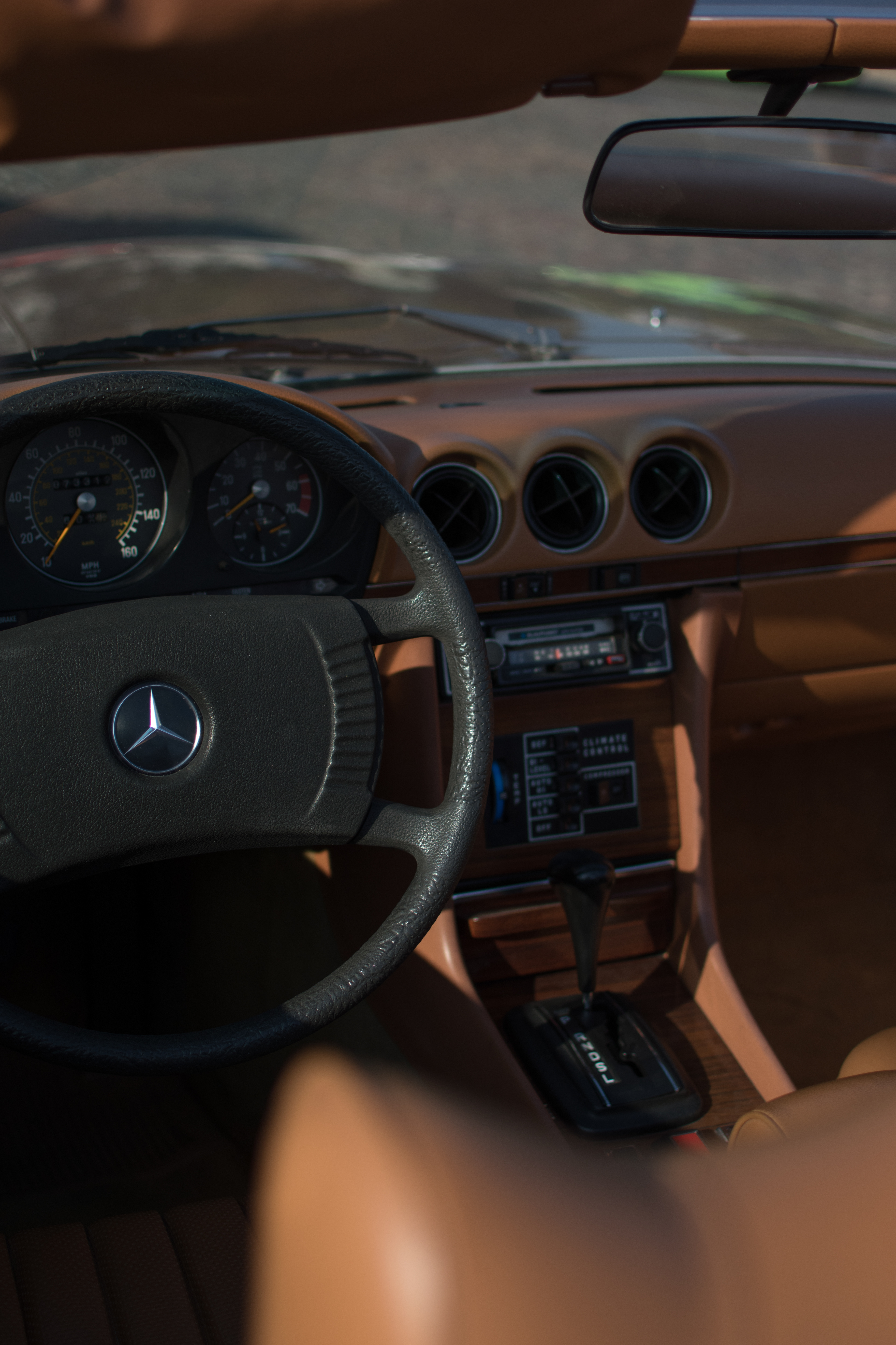 On constate en l'occurence que l'équipement et la qualité d'ajustement sont irréprochables, signe que l'accent a été mis sur le confort. Trente ans après, le mobilier n'est ni fatigué ni usé. Certes, ça manque de fantaisie, mais quelle noblesse ! Les plastiques noirs ne jurent pas autour du bois. Le volant semble énorme, mais il est harmonieux en proportion de l'instrumentation. C'est simple, c'est fonctionnel, c'est limpide.